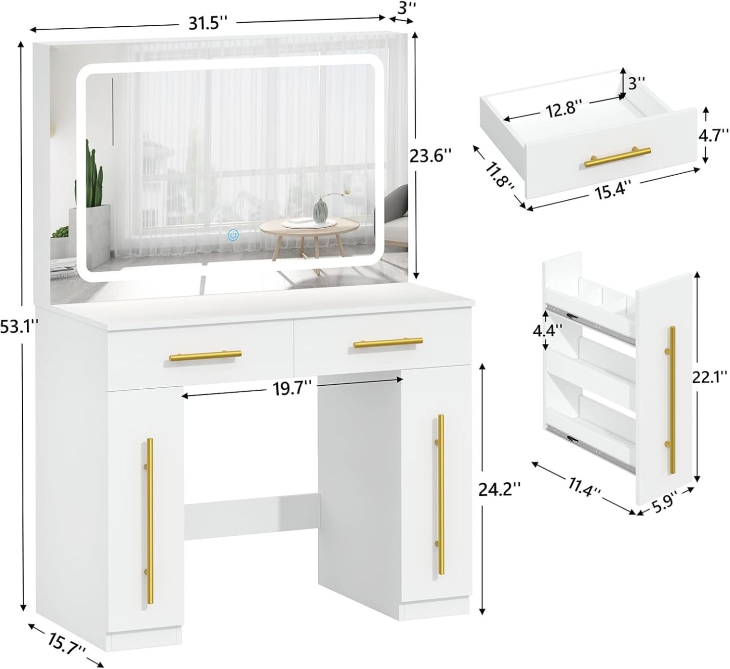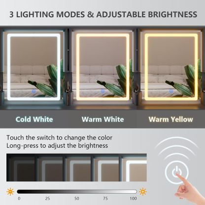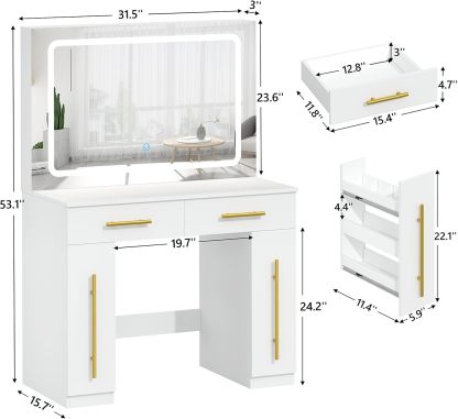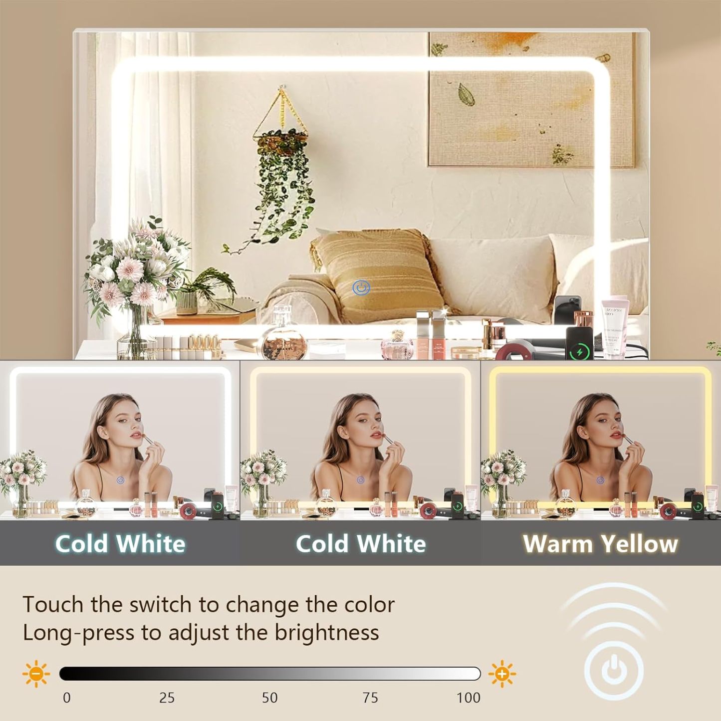 - 【3 Lighting Modes & Brightness Adjustable】This vanity desk features a large LED mirror with 3 color modes (warm, natural, and cool), which is safer than ordinary light bulbs. You can change the color mode by pressing the touch switch, or adjust the brightness by long-pressing the touch switch.