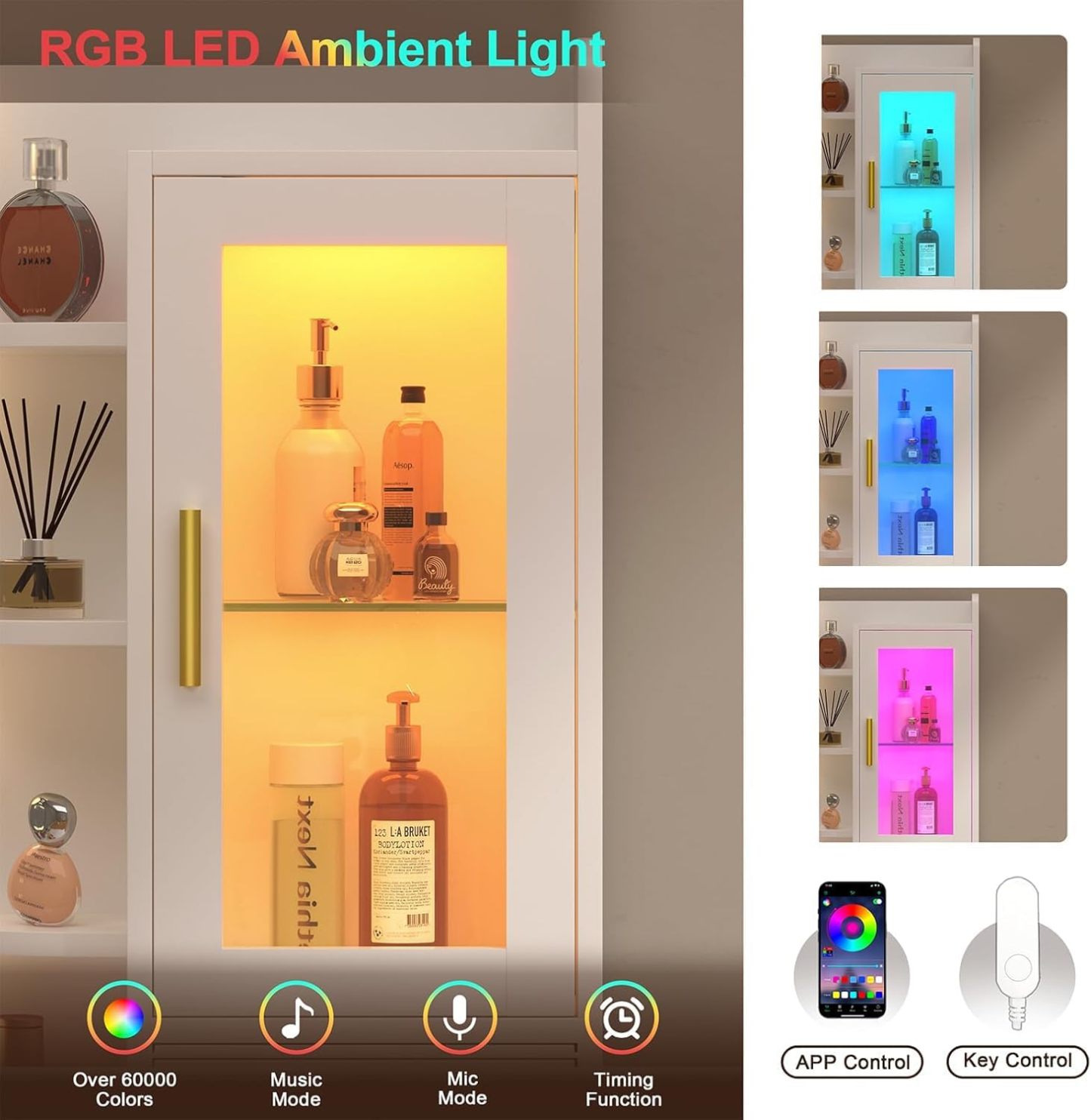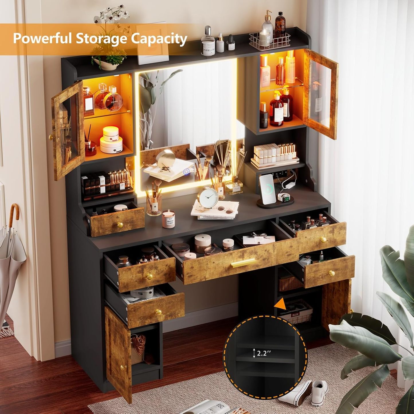 - 【Vanity Desk with RGB Cabinets】This vanity is equipped with 2 cabinets with height-adjustable laminates and an RGB lighting system, which can be controlled via APP or a switch. With over 60,000 static colors available and multiple lighting modes, the system can synchronize to music for a stunning visual experience while you relax or entertain.