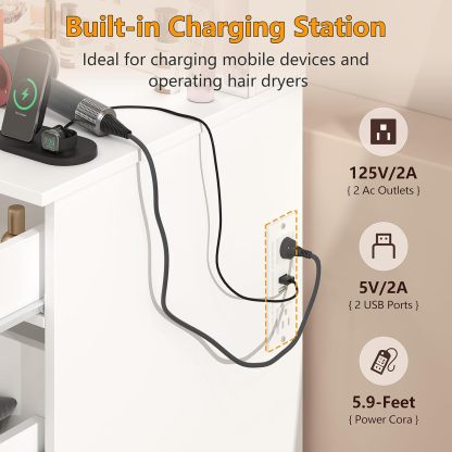 - 【Vanity Desk with Charging Station】This modern vanity desk comes with a power strip that includes 2 standard plug sockets and 2 USB ports, allowing you to sit at your vanity and use your hair dryer or curling iron within easy reach and charge your phone, tablet, or other electronics.